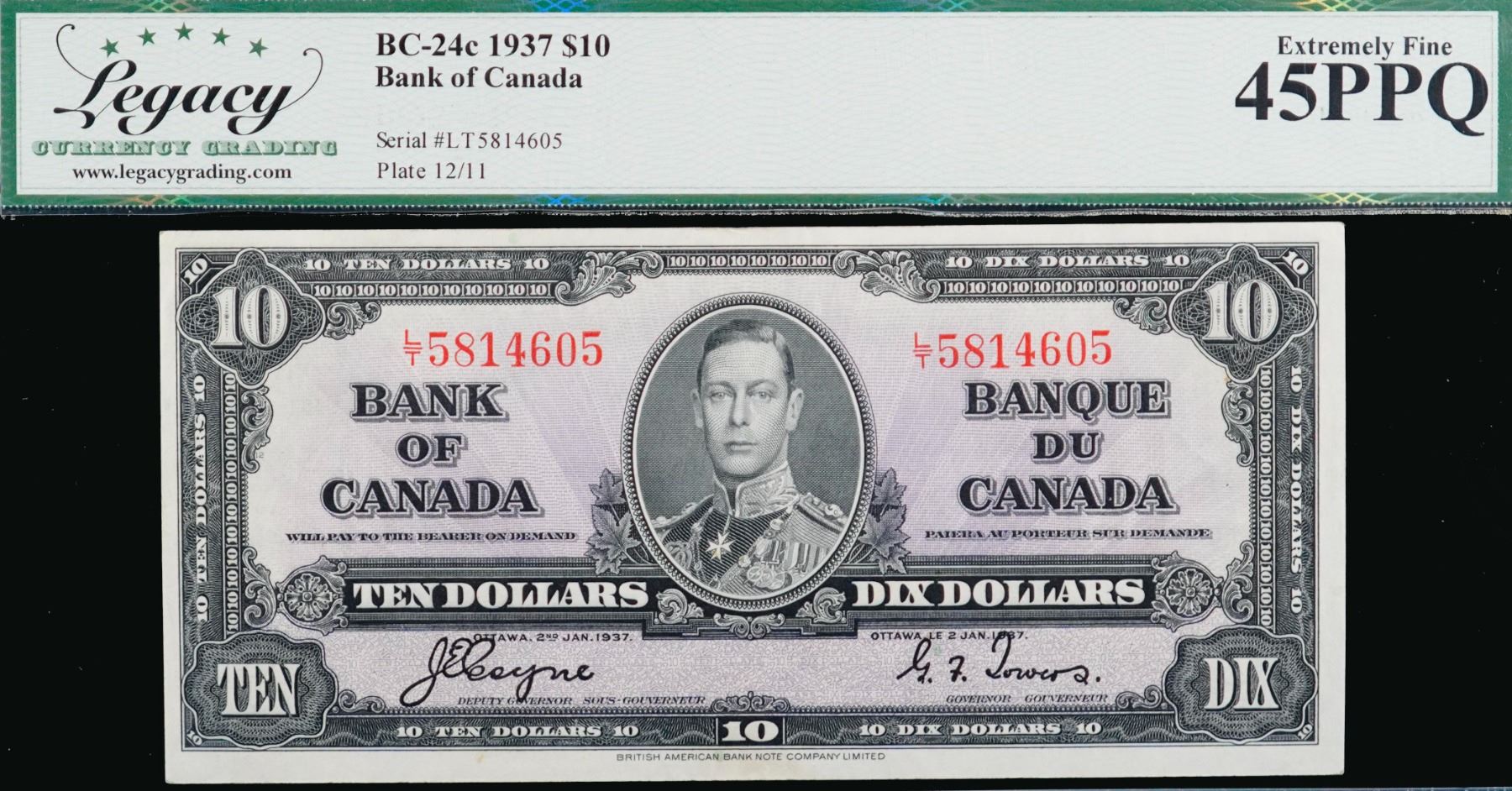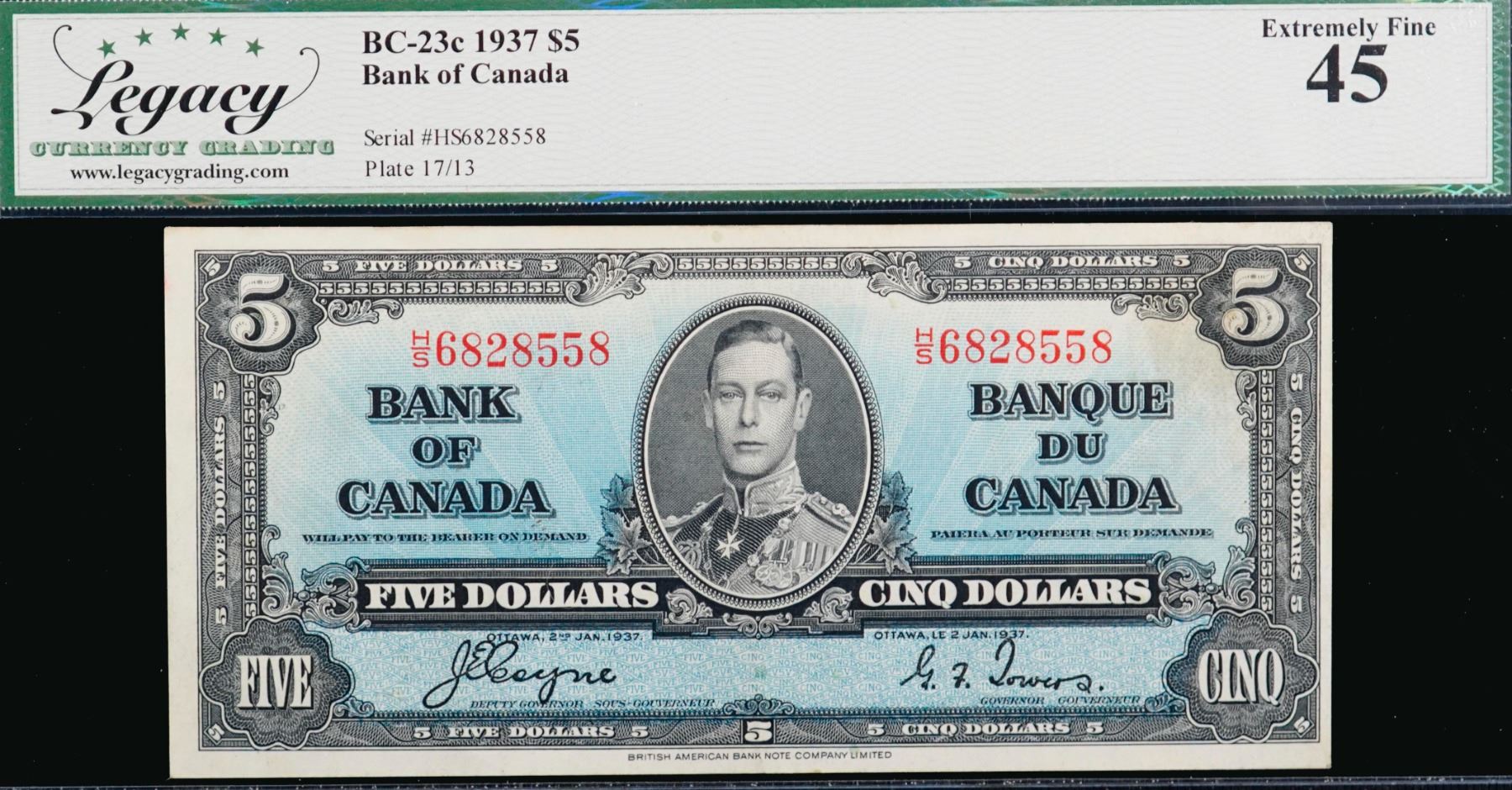 1937 $5 BC-23c #HS6828558, 1937 $10 BC-24c #LT5814605, and 1937 $20 BC-25c #KE1583963 all Legacy Choice Extra Fine-45 graded, lot of 3 notes.