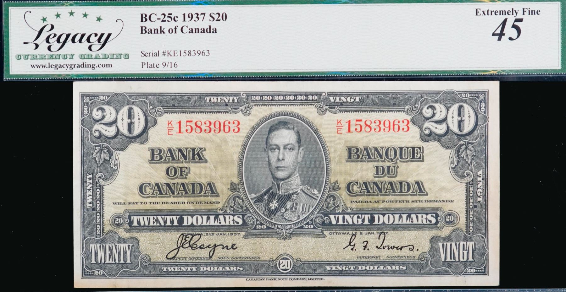 1937 $5 BC-23c #HS6828558, 1937 $10 BC-24c #LT5814605, and 1937 $20 BC-25c #KE1583963 all Legacy Cho