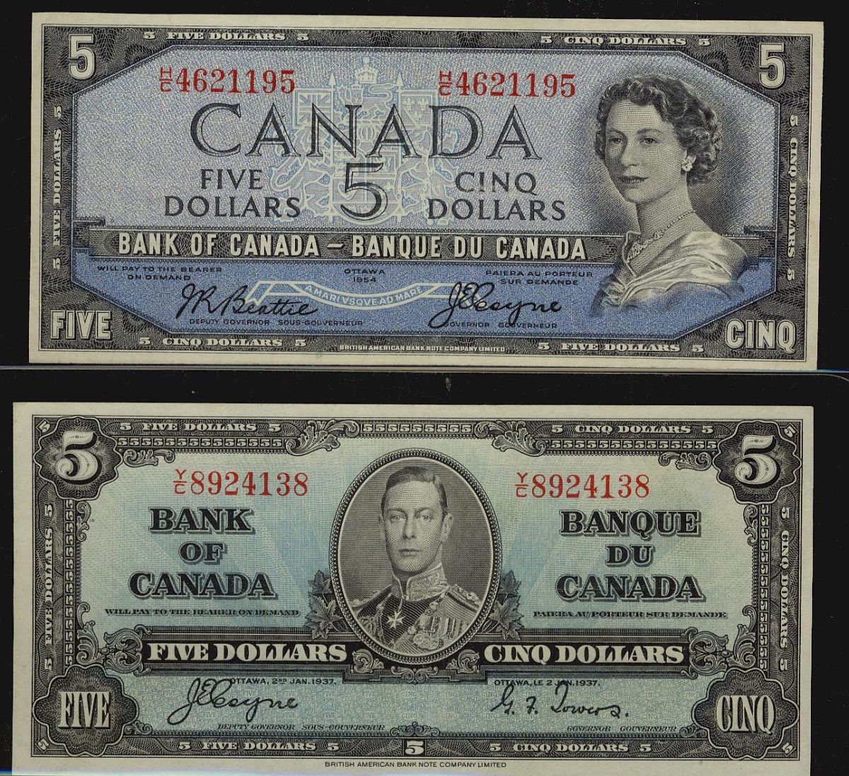 1937 $5 BC-23c #Y/C8924138 & 1954 $5 DF BC-31b #H/C4621195. Lot of two notes both EF-AU.