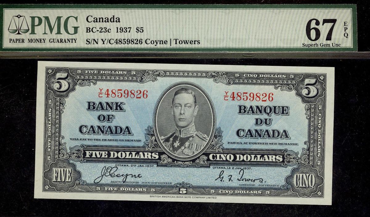 1937 $5 BC-23c #YC4859826 PMG Superb Gem UNC67EPQ. Wow, a pristine example.