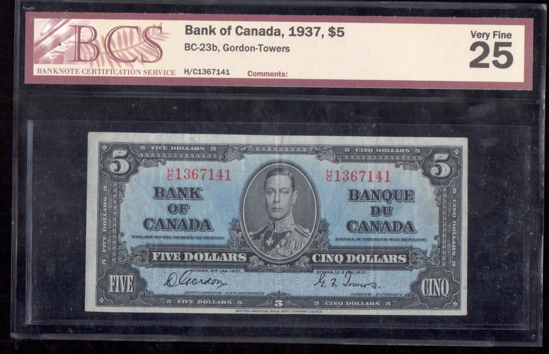 Lot 30 1937 $5 Bank of Canada Gordon-Towers BCS VF 25
