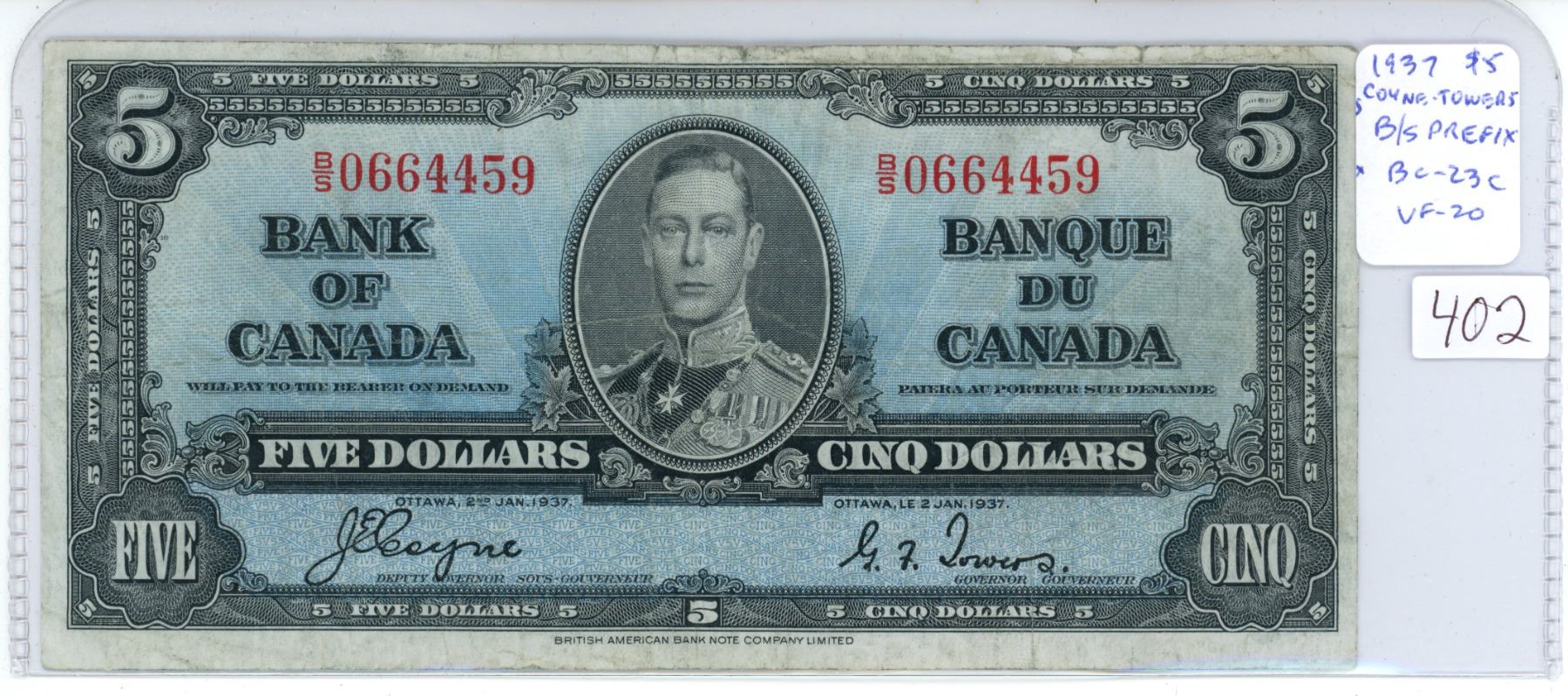 1937 $5. Coyne-Towers signatures. B/S Prefix. BC-23c. VF-20.