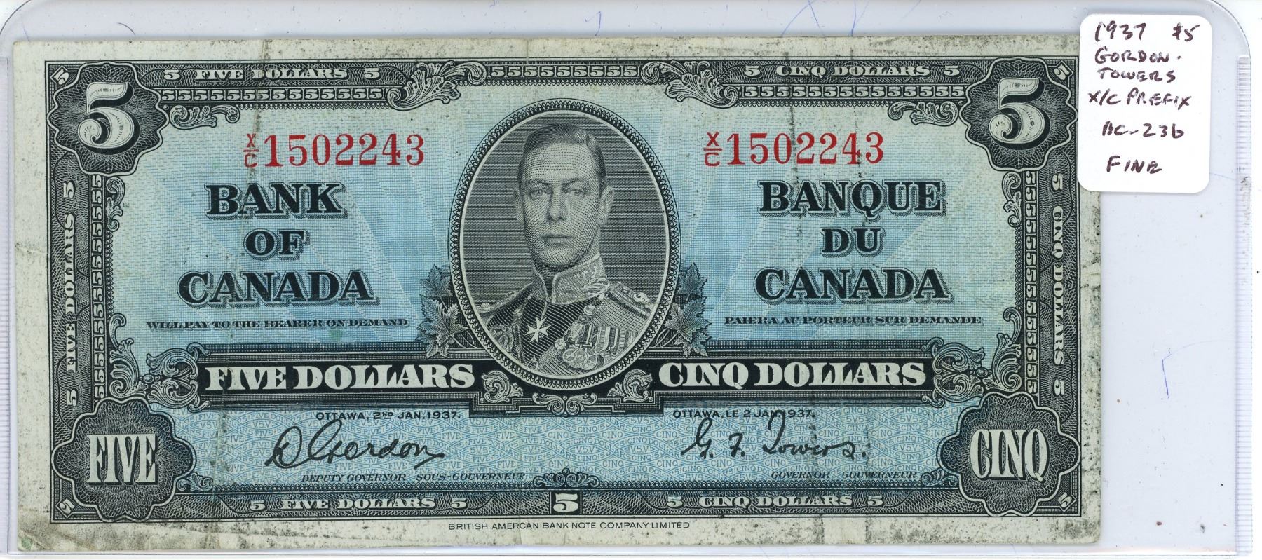 1937 5 Dollar Gordan Towers X/C Prefix Nc-23b Fine-12