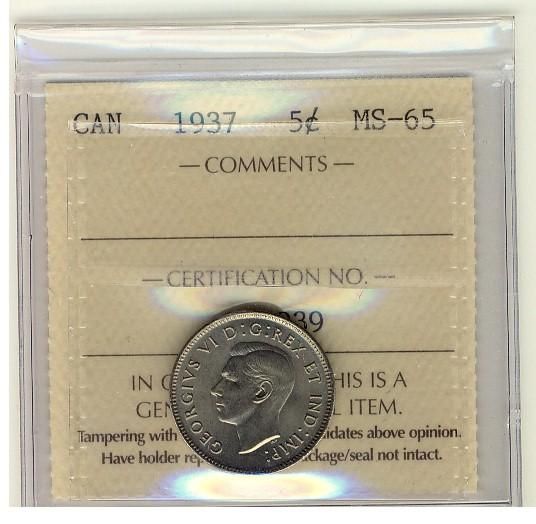 1937 5¢ ICCS MS65. A nice GEM.