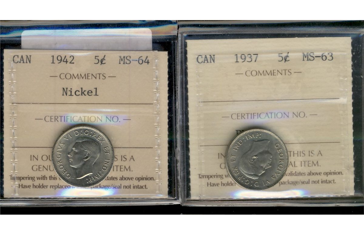 1937 5¢ MS63 & 1942 Nickel MS64. Lot of 2 ICCS graded coins.