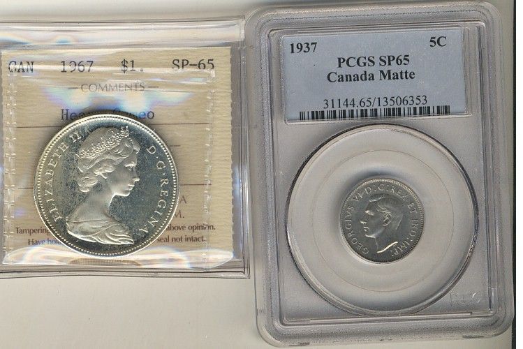 1937 5¢ PCGS & 1967 $1 ICCS. Lot of 2 SP65 coins.