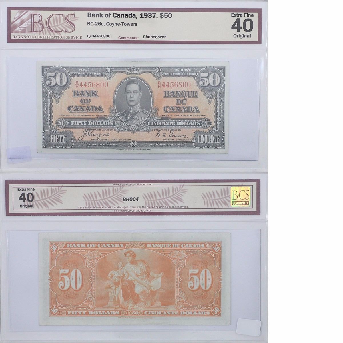 1937 $50.00 note from the Bank of Canada; cat code BC-26c, Coyne-Towers signatures, BCS Certified EF-40, Original