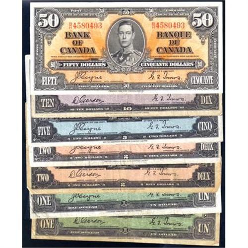 1937 Fifty Dollars, Coyne-Towers, BC-26c Serial Number B/H4580493, VF. Plus 1937 One Dollar, Gordon-Towers, BC-21c and Coyne-Towers, BC-21d, 1937 Two Dollars, Gordon-Towers, BC-22b and Coyne-Towers, BC-22c, 1937 Five Dollars, Coyne-Towers, BC-23c and 1937 Ten Dollars, Gordon-Towers, BC-24b, all VG or better, a couple with problems. Total seven notes