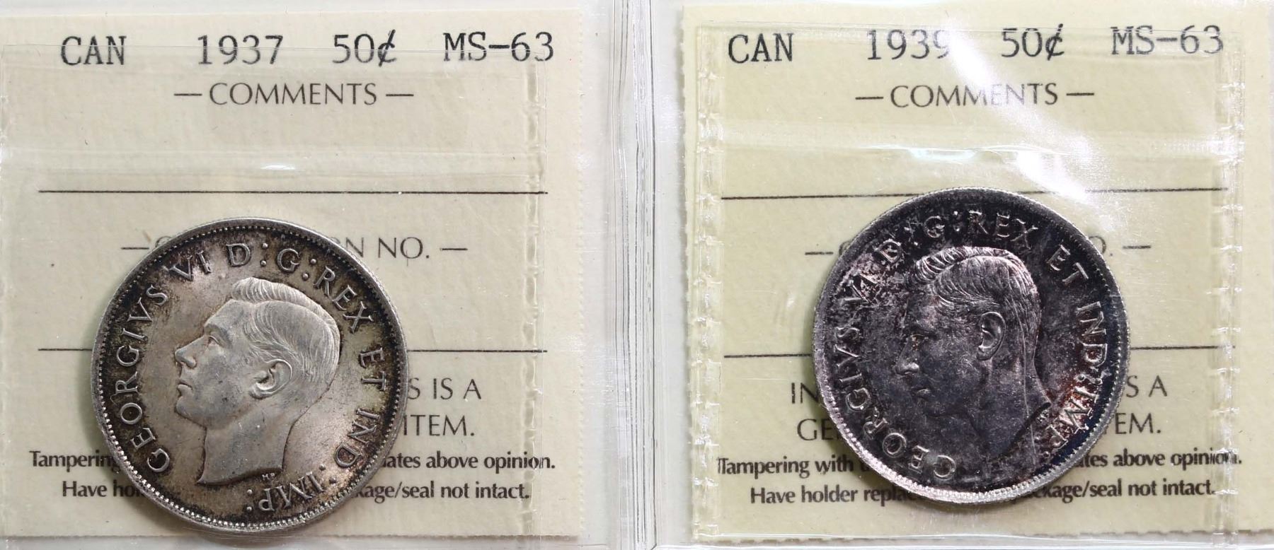 1937 50¢, 1939. Both coins ICCS Choice Mint State-63