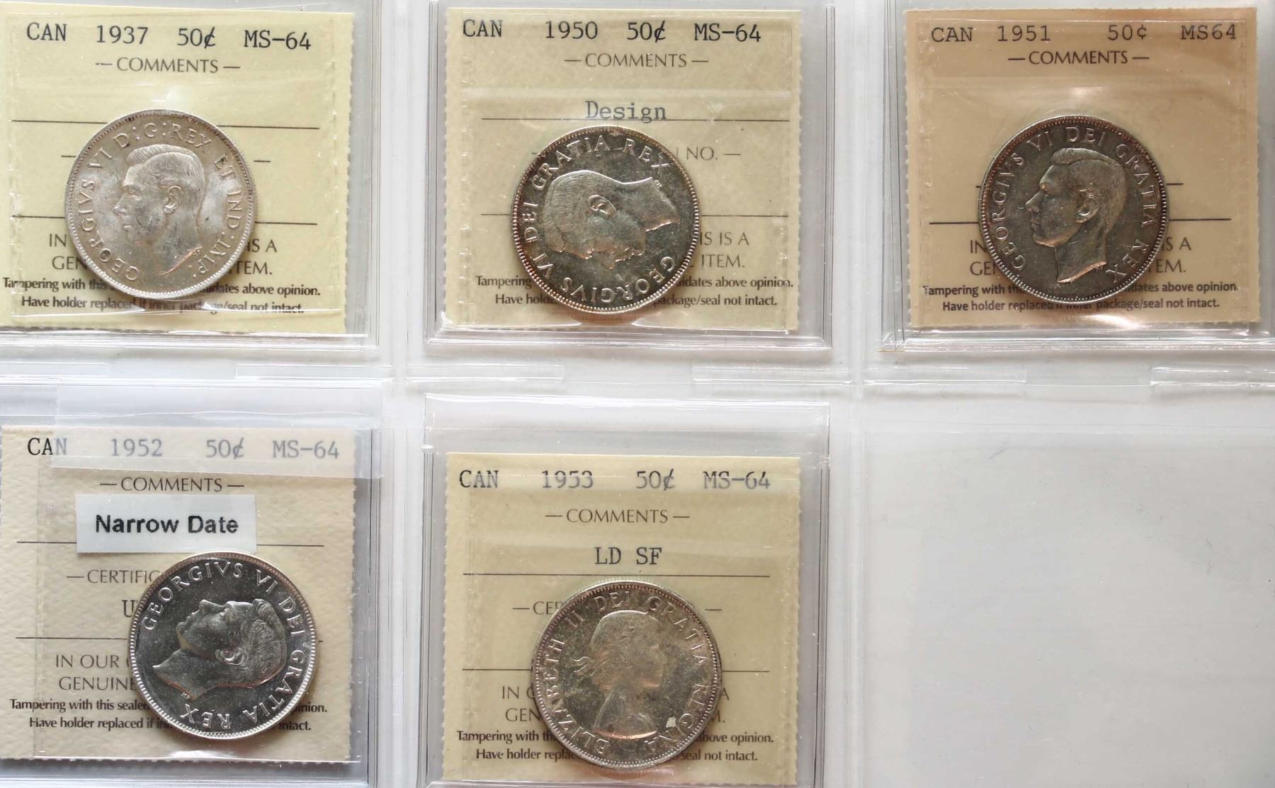 1937 50¢, 1950 "Design", 1951, 1952 "Narrow date", 1953 "LD SF" All 5 coins ICCS Very Choice Mint State-64.