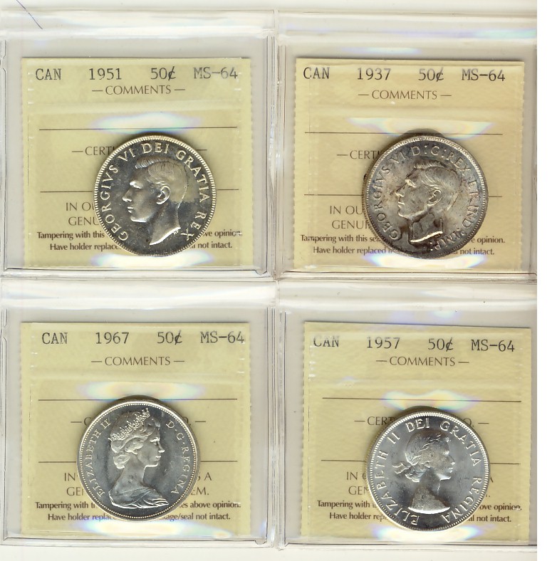1937 50¢, 1951, 1957 & 1967 ICCS MS64. Lot of 4 coins.