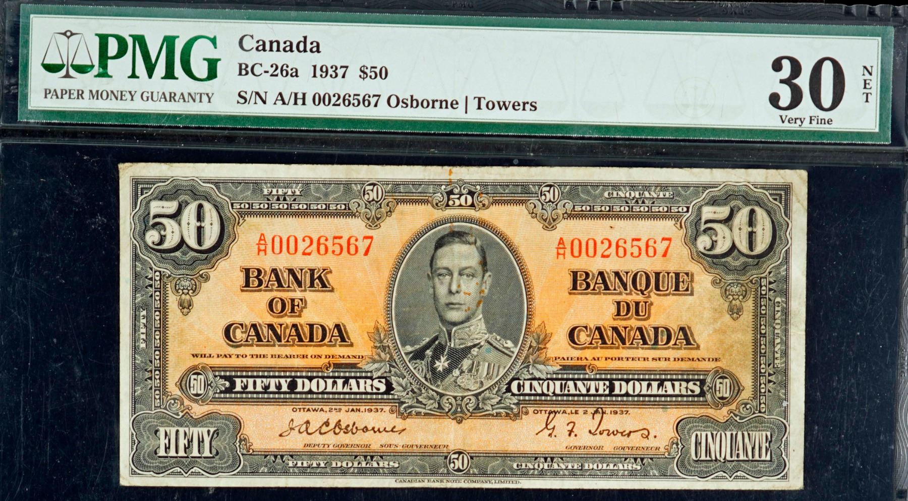 1937 $50 BC-26a #A/H0026567 PMG Choice Very Fine-30 with insignificant rust. Scarce Osborne-Towers signatures.