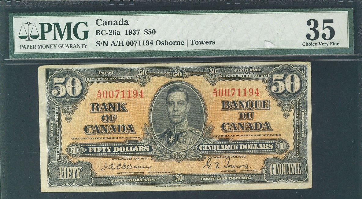 1937 $50 BC-26a A/H007194 PMG VF35, about EF, scarce Osborne signatures. Scarce signatures.