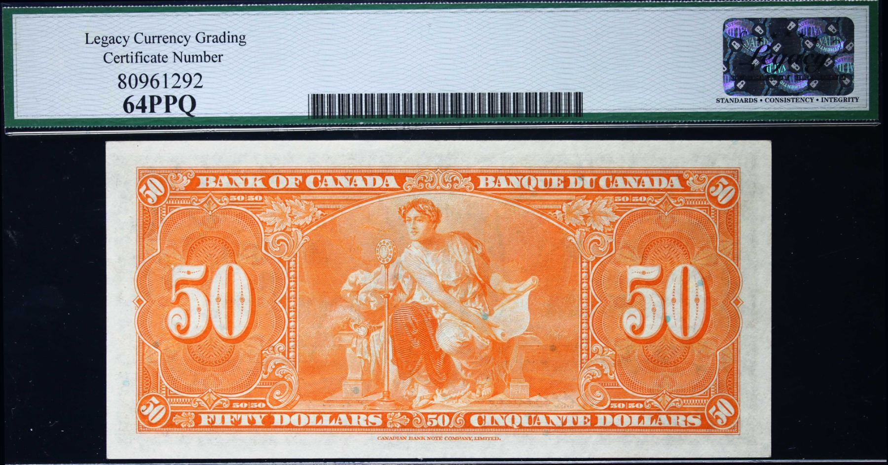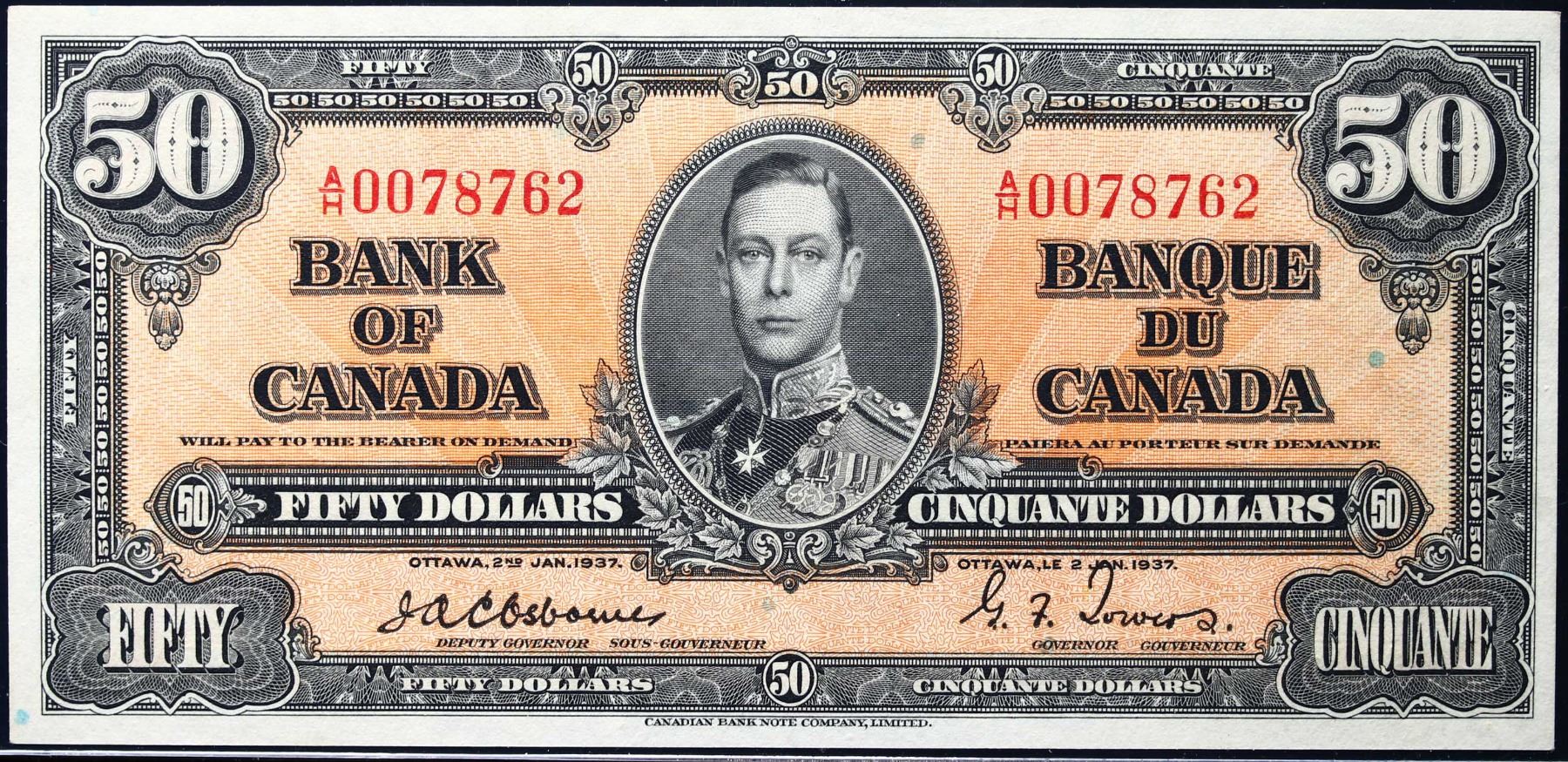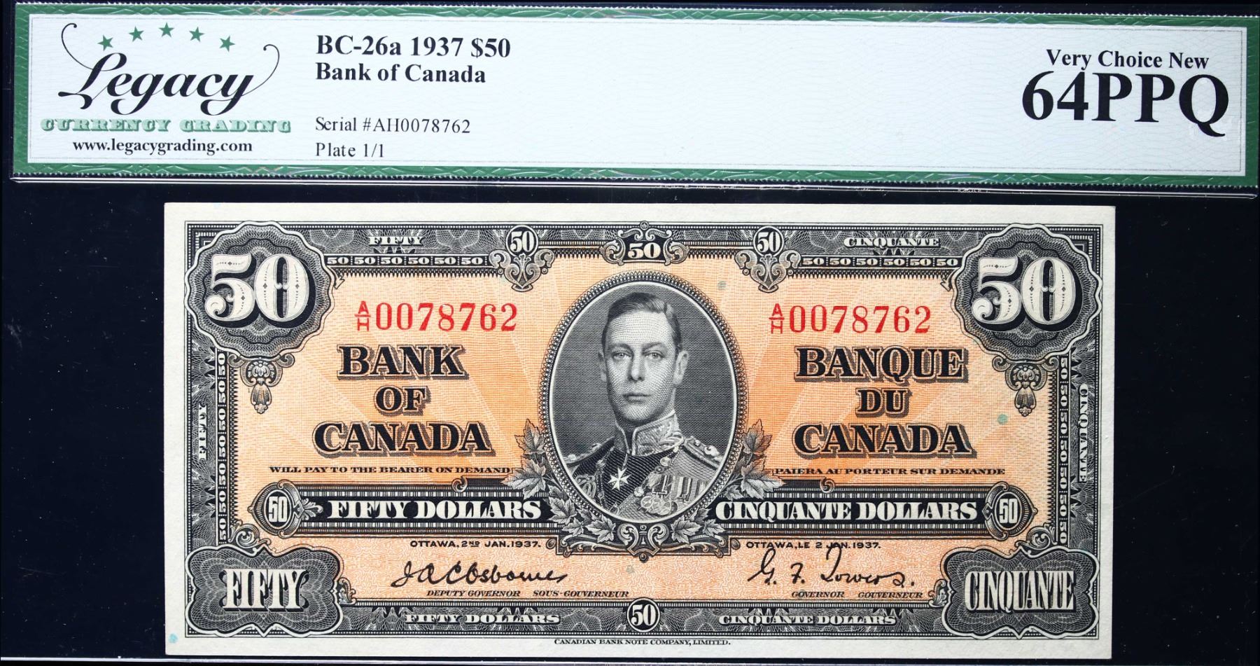 1937 $50 BC-26a #A/H0078762 LCG Choice Uncirculated-64PPQ. Rare Osborne-Towers signatures. Amongst the best examples seen and handled by TCNC. The note is attractive with vibrant colours and great embossing. Excessively nice and desirable example. Worth a premium bid.