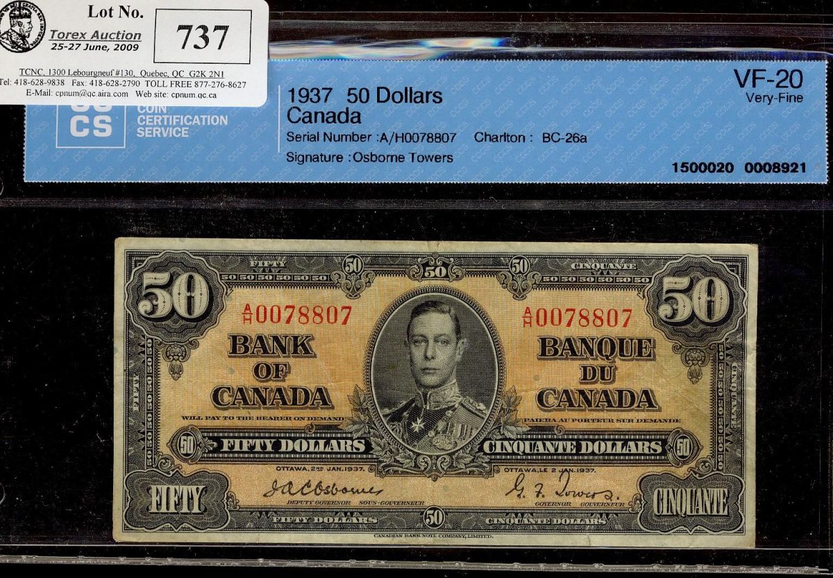 1937 $50 BC-26a Osborne CCCS VF20 #A/H0078807. A decent example with nice colours.