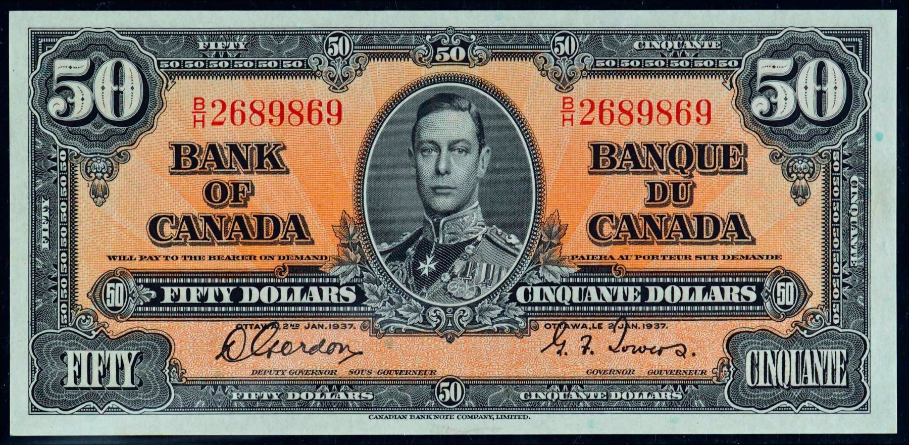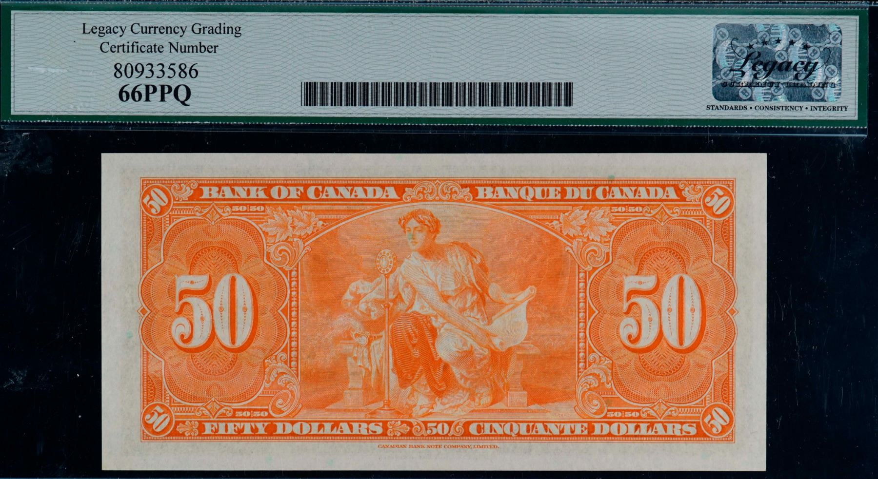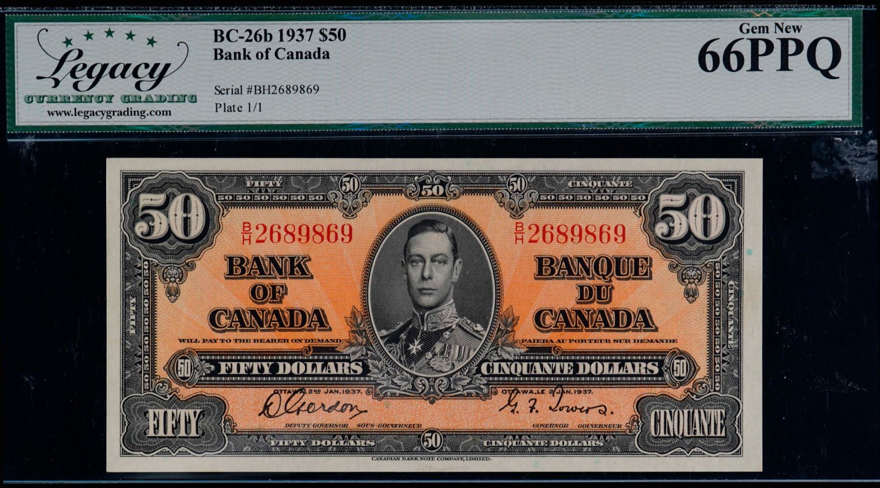 1937 $50 BC-26b #B/H2689869 Legacy Superb Gem Uncirculated-66PPQ. This is a pristine issue with great eye appeal, good margins and superb embossing.
