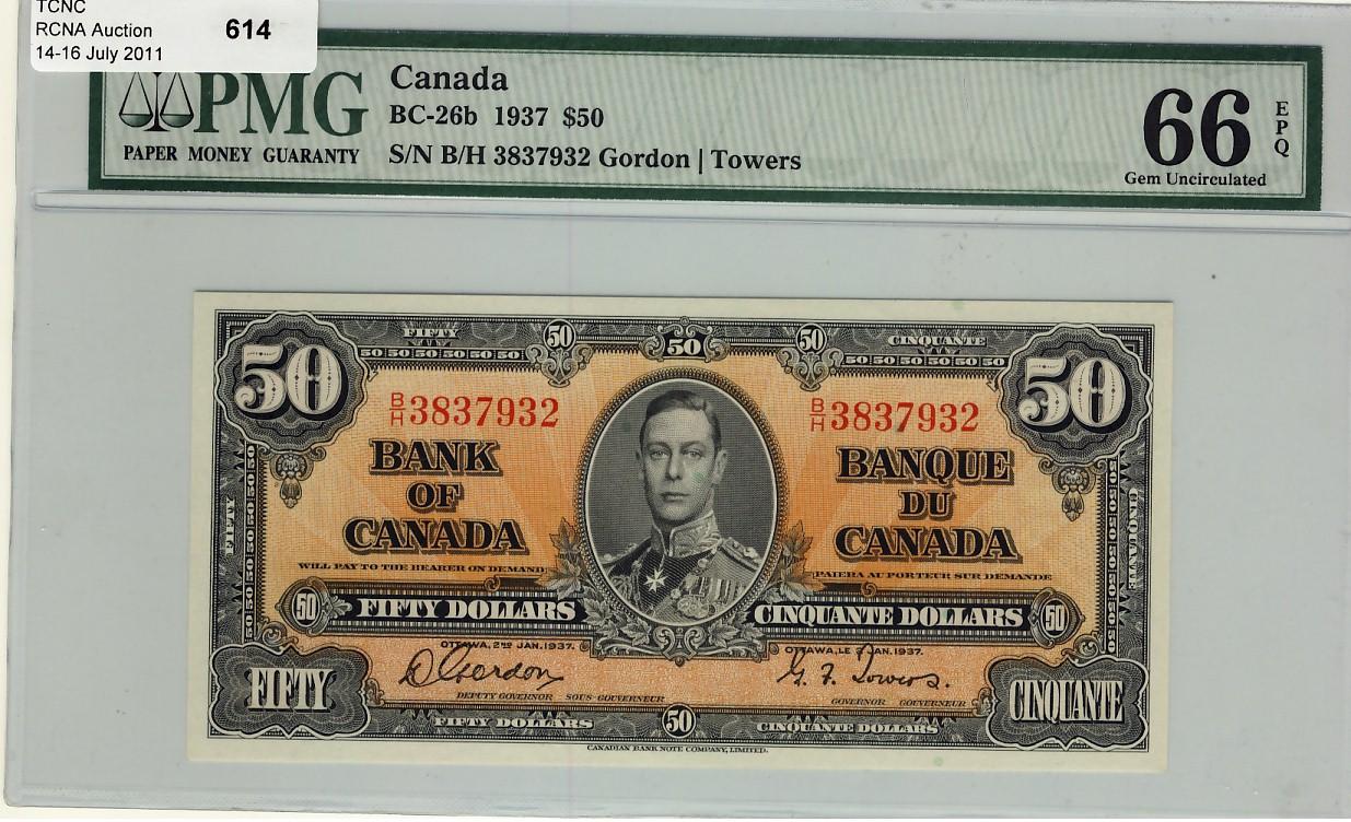 1937 $50 BC-26b B/H3837932 PMG UNC66EPQ, very rare in this grade.