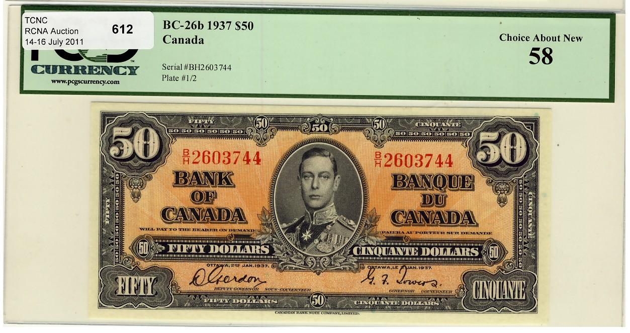 9. The cataloguer has taken every reasonable measure to ensure that all of the lots in this sale are as described and genuine. All raw coins and banknotes have been graded by the cataloguer or the auction house which represent our best professional opinion. To grade coins and banknotes, we use Canadian grading standards, 31 years of experience and good conscience. Grading is a subjective description in the opinion of the cataloguer or the auction house. Among experts there are often differences of opinion on the grading and the eye appeal of a coin. The strike and the state of preservation are often debated. TCNC acts as an agent between consignors and buyers. TCNC does not guarantee that any coin or banknote catalogued will meet the standards, or the grade, of any third party grading companies. No warranty, whether impressed or implied.