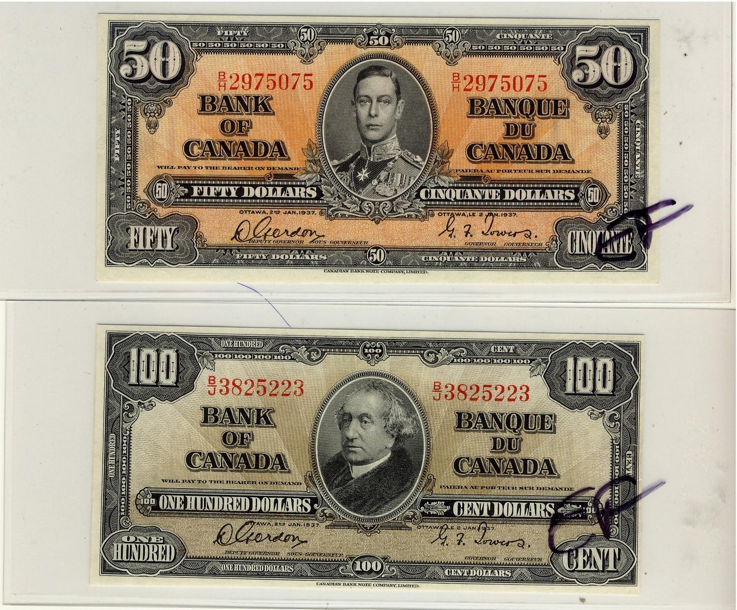 1937 $50 BC-26c & $100 BC-27b. Lot of 2 notes. EF.
