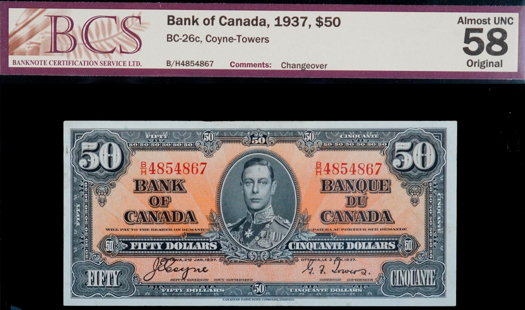 1937 $50 BC-26c #B/H4854867 BCS Choice About Uncirculated-58 Original. An ultra bright example.