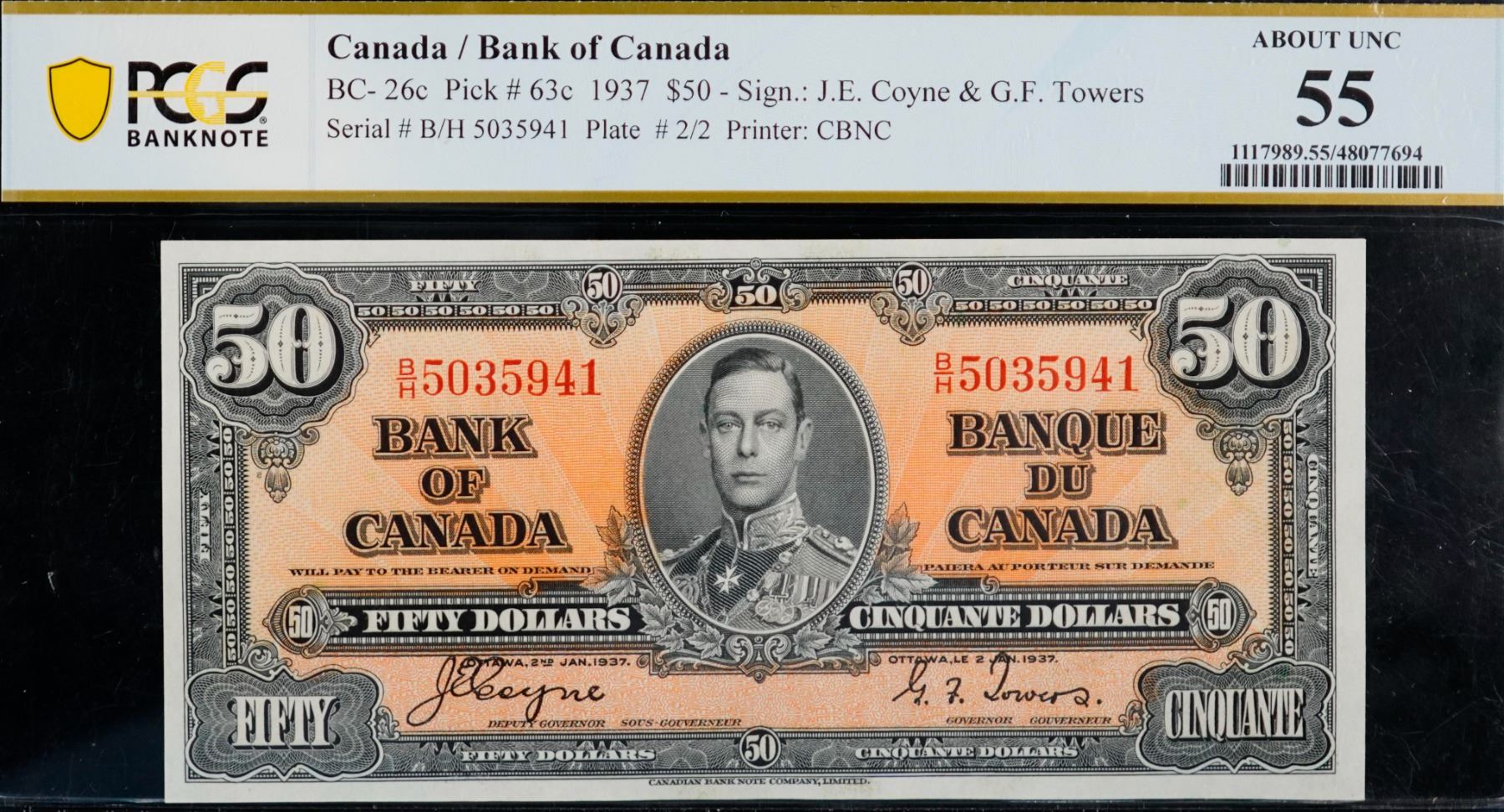 The cataloguer has taken every reasonable measure to ensure that all of the lots in this sale are as described and genuine. All raw coins and banknotes have been graded by the cataloger or the auction house which represent our best professional opinion. To grade coins and banknotes, we use Canadian grading standards, 42 years of experience and good conscience. However, grading is a subjective description in the opinion of the cataloger or the auction house. Among experts there are often differences of opinion on the grading and the eye appeal of a coin. The strike and the state of preservation are often debated. The Canadian Numismatic Company acts as an agent between consignors and buyers. The Canadian Numismatic Company does not guarantee that any coin or banknote cataloged will meet the standards, or the grade, of any third party grading companies. No warranty, whether impressed or implied. Items are as is, no warranty given. We cannot accept responsibility and waive all liability resulting in financial losses, and or incidentals accruing from the sale of any items, nor can we guarantee that items graded by third party services will grade the same if submitted to a different grading service or re-submitted to the same company. Statements by The Canadian Numismatic Company regarding the condition, the eye appeal, the strike and the population of items are for guidance only. All lots offered are sold "AS IS". Title to all lots remains with the auction house until paid for in full by the purchaser. But they are held at the risk of the purchaser once the time of the sale.