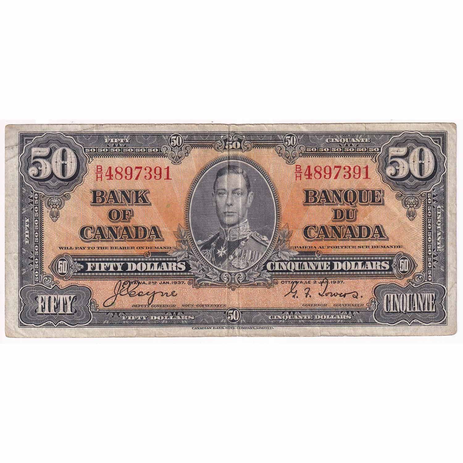 1937 $50 BC-26c, Bank of Canada, Coyne-towers, B/H Prefix VF-EF