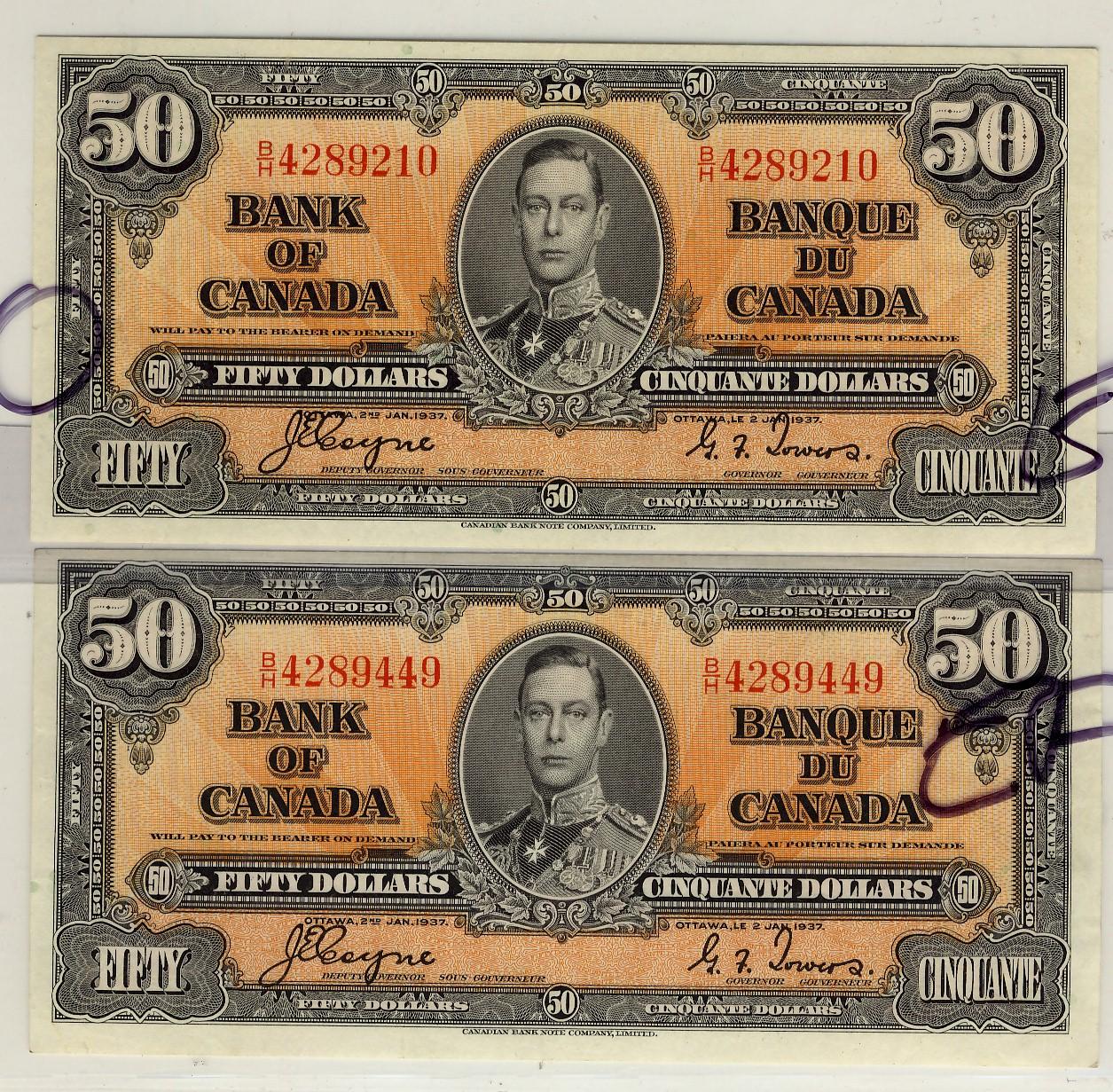 1937 $50 BC-26c. Lot of 2 notes. EF.