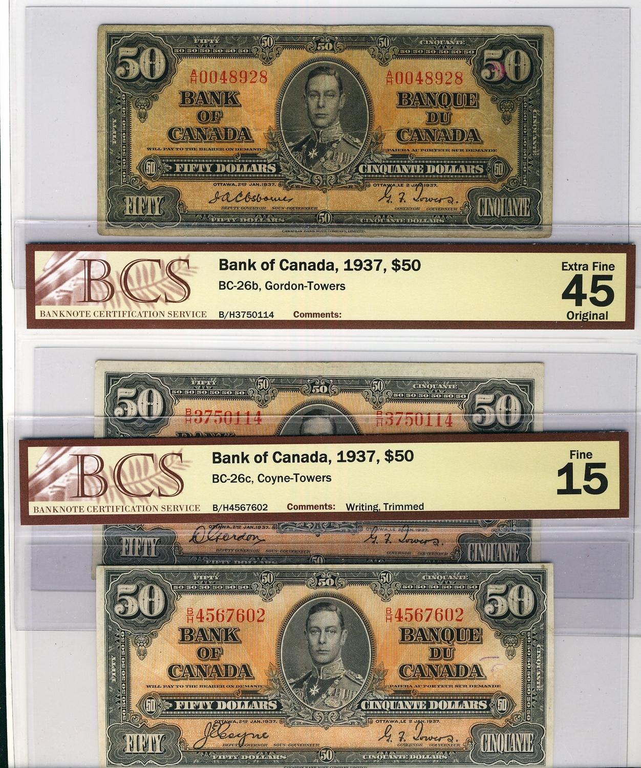 1937 $50 BC-27a VG8, BC-27b EF45 & BC-27c F15. Lot of 3 BCS graded notes.