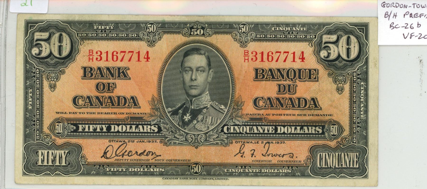 1937 $50. George VI. Gordon-Towers signatures. B/H Prefix. BC-26b. VF-20.