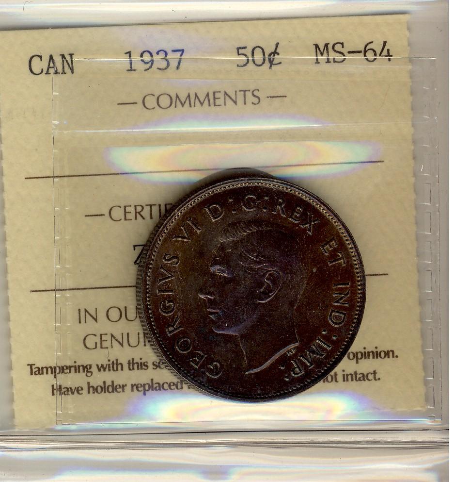 1937 50¢ ICCS MS64. Dark tone with lots of underlying lustre.