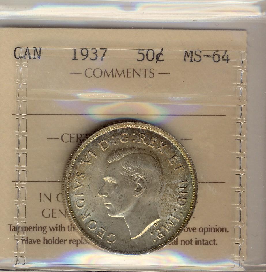 1937 50¢ ICCS MS64. Lustrous with hint of golden to green tint.