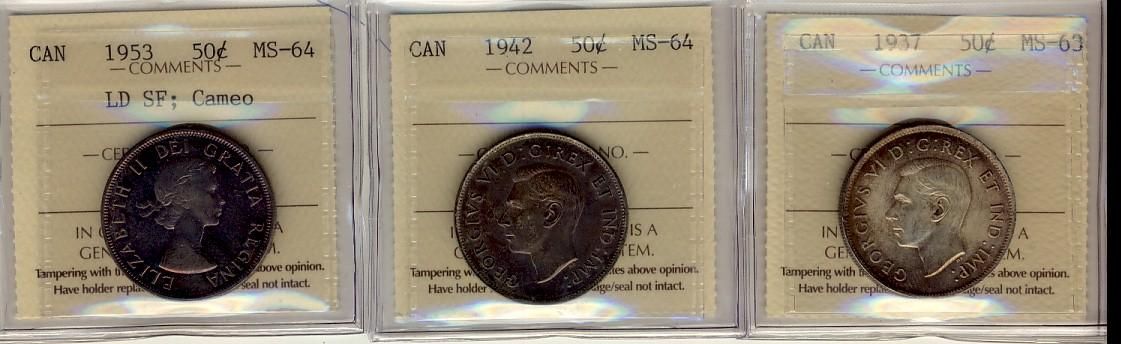 1937 50¢ MS63, 1942 50¢ MS64 and 1953 LD SF, cameo MS64. Lot of three coins all ICCS graded.