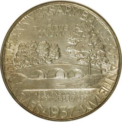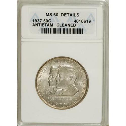 <B>1937 50C Antietam--Cleaned--ANACS. MS60 Details.</B></I> NGC Census: (0/2151). PCGS Population (2/4107). Mintage: 18,028. Numismedia Wsl. Price for NGC/PCGS coin in MS60: $585. (#9229)<BR><BR><b>Shipping:</b> Coins & Currency (<a target="_blank" href="http://www.heritageauctions.com/common/shipping.php">view shipping information</a>)