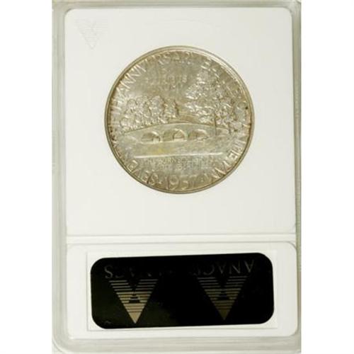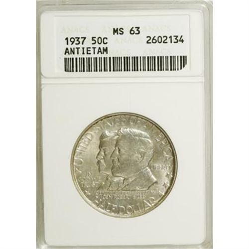 <B>1937 50C Antietam MS63 ANACS.</B></I> This well-defined Antietam half is primarily silver-gray, though elements of tan and silver-blue appear at the margins. Only a few wispy abrasions on each side preclude a finer designation.<BR><BR><b>Shipping:</b> Coins & Currency (<a target="_blank" href="http://www.heritageauctions.com/common/shipping.php">view shipping information</a>)
