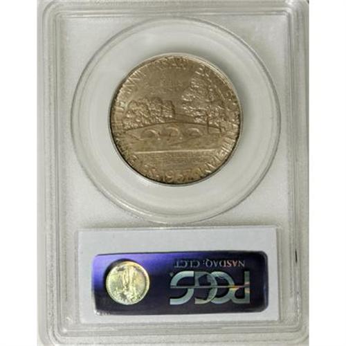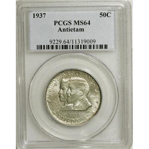 <B>1937 50C Antietam MS64 PCGS.</B></I> Well struck with satin luster and carefully preserved surfaces. The silver-white obverse is essentially untoned, but the reverse displays deep plum coloration. Surface blemishes are minimal, and include one small milling mark on Robert E. Lee's jaw. <BR><BR><b>Shipping:</b> Coins & Currency (<a target="_blank" href="http://www.heritageauctions.com/common/shipping.php">view shipping information</a>)