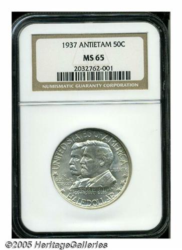 <B>1937<50C> Antietam MS65 NGC.</B></I> A frosty Gem example of this popular Civil War commemorative, draped in silver-gray patina on both sides.