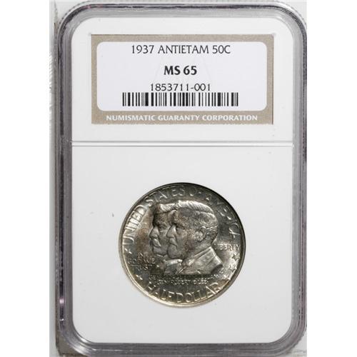<B>1937<50C> Antietam MS65 NGC.</B></I> Patches of violet patina appear in front of the generals on the obverse and at the SEV of SEVENTY on the reverse. Nicely struck with attractive luster.