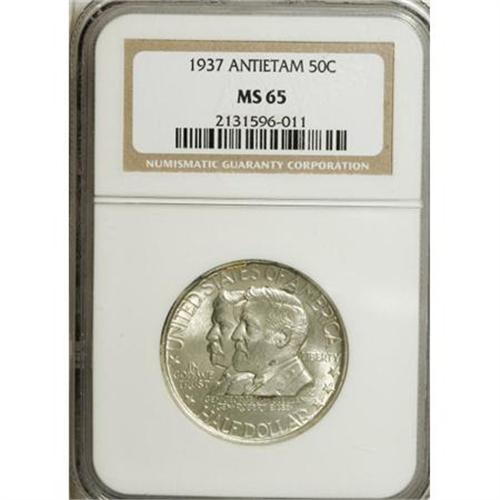 <B>1937 50C Antietam MS65 NGC.</B></I> This lustrous and impressively smooth Gem has faint olive toning with an occasional russet freckle near the margins. A popular Civil War type.<BR><BR><b>Shipping:</b> Coins & Currency (<a target="_blank" href="http://www.heritageauctions.com/common/shipping.php">view shipping information</a>)