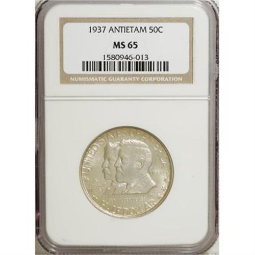 <B>1937 50C Antietam MS65 NGC.</B></I> NGC Census: (838/752). PCGS Population (1366/1272). Mintage: 18,028. Numismedia Wsl. Price for NGC/PCGS coin in MS65: $805. (#9229)<BR><BR><b>Shipping:</b> Coins & Currency (<a target="_blank" href="http://www.heritageauctions.com/common/shipping.php">view shipping information</a>\)