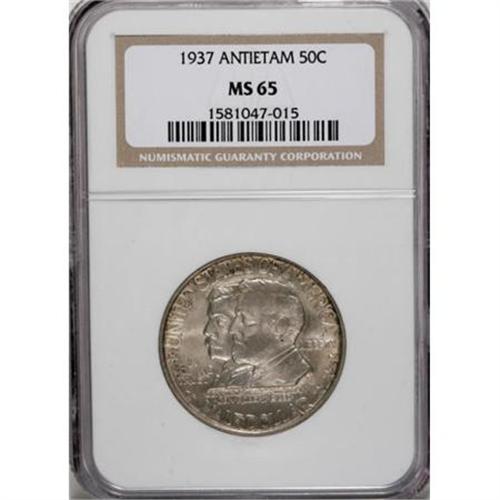 <B>1937 50C Antietam MS65 NGC.</B></I> The obverse of this luminous Gem is gray-gold, while the reverse's patina is closer to tan. A solidly struck representative of this Civil War issue, carefully preserved with a solitary mark at McClellan's brow.<BR><BR><b>Shipping:</b> Coins & Currency (<a target="_blank" href="http://www.heritageauctions.com/common/shipping.php">view shipping information</a>)