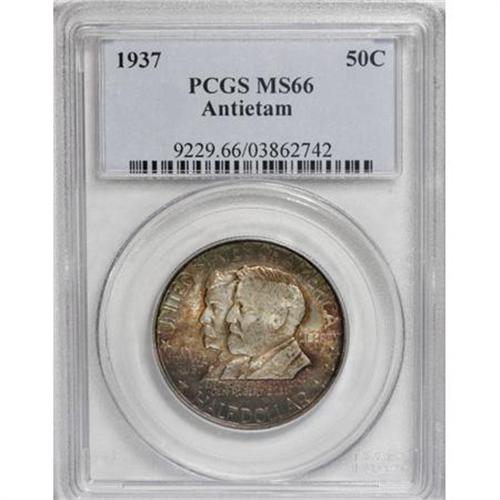 <B>1937 50C Antietam MS66 PCGS.</B></I> Decisively struck and slightly satiny with deep plum, claret, and reddish-orange colors at the margins. A well-defined example from one of the most notable Civil War commemorative issues of the classic era.<BR><BR><b>Shipping:</b> Coins & Currency (<a target="_blank" href="http://www.heritageauctions.com/common/shipping.php">view shipping information</a>)