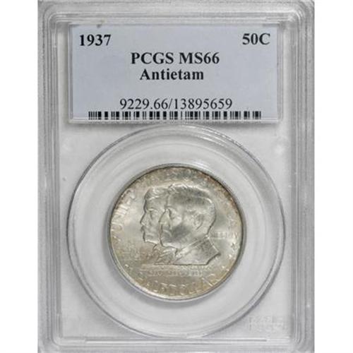 <B>1937 50C Antietam MS66 PCGS.</B></I> PCGS Population (1021/232). NGC Census: (591/160). Mintage: 18,028. Numismedia Wsl. Price for NGC/PCGS coin in MS66: $980. (#9229)<BR><I>From The Frank DuVall Collection of U.S. Commemoratives.</B></I><BR><BR><b>Shipping:</b> Coins & Currency (<a target="_blank" href="http://www.heritageauctions.com/common/shipping.php">view shipping information</a>\)