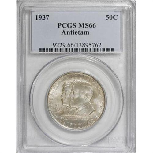 <B>1937 50C Antietam MS66 PCGS.</B></I> PCGS Population (1021/232). NGC Census: (591/160). Mintage: 18,028. Numismedia Wsl. Price for NGC/PCGS coin in MS66: $980. (#9229)<BR><I>From The Frank DuVall Collection of U.S. Commemoratives.</B></I><BR><BR><b>Shipping:</b> Coins & Currency (<a target="_blank" href="http://www.heritageauctions.com/common/shipping.php">view shipping information</a>\)