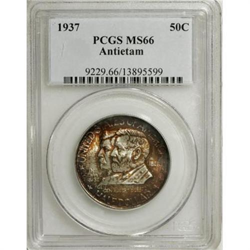 <B>1937 50C Antietam MS66 PCGS.</B></I> PCGS Population (1021/232). NGC Census: (591/160). Mintage: 18,028. Numismedia Wsl. Price for NGC/PCGS coin in MS66: $980. (#9229)<BR><I>From The Frank DuVall Collection of U.S. Commemoratives.</B></I><BR><BR><b>Shipping:</b> Coins & Currency (<a target="_blank" href="http://www.heritageauctions.com/common/shipping.php">view shipping information</a>\)