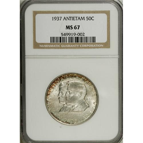 <B>1937 50C Antietam MS67 NGC.</B></I> Slivers of deep orange-gold and crimson occupy portions of the margins of this intensely lustrous commemorative half dollar. Impeccably preserved surfaces exhibit sharply defined motifs.<BR><BR><b>Shipping:</b> Coins & Currency (<a target="_blank" href="http://www.heritageauctions.com/common/shipping.php">view shipping information</a>)