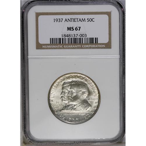 <B>1937<50C> Antietam MS67 NGC.</B></I> Sparkling luster is in no way impeded by the thin veneer of tan-gold patina. Sharply struck throughout, with no signs of blemishes. A small toning spot occurs to he left of McClellan's mustache.