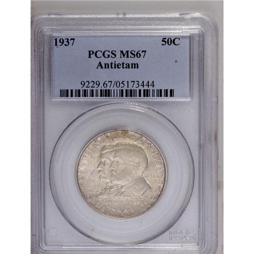 <B>1937<50C> Antietam MS67 PCGS.</B></I> Hazy russet toning appears on both sides of this Superb Gem. A lustrous example with crisp detail and seemingly mark-free surfaces.