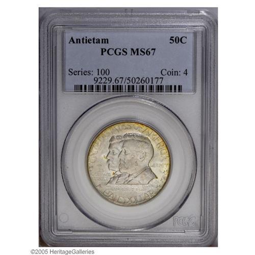 <B>1937<50C> Antietam MS67 PCGS.</B></I> Minimally marked with canary-yellow patina along part of the rims of both the obverse and reverse. A highly sought after and collectable issue.