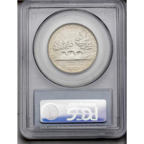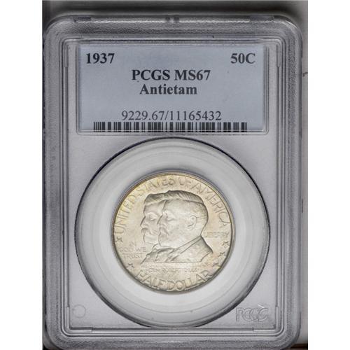 <B>1937<50C> Antietam MS67 PCGS.</B></I> Tan and peach with speckled hints of canary-yellow patina and a notable impression. Nearly mark-free with a few well-disguised ticks preventing an even finer grade. <BR><BR><B>Important notice:</B> Heritage usually auctions material at the rate of 200-250 lots per hour. On some occasions eBay Live bid software or the Internet may not be able to keep up with the pace of the auction. We recommend placing a realistic absentee bid now as insurance to avoid disappointment. Occasionally the auctioneer may eliminate or reject an eBay Live bid, and the auctioneer may also reopen a lot after the close of the eBay live bidding (usually because we missed an audience bid), and may reject your bid even if it shows you as the winning bidder. By bidding via eBay Live, you agree that Heritage may award the lot to another bidder at its sole discretion under the circumstances described above or any other reasonable circumstances. Since eBay bids are not shown to us until we open the lot on the floor, we treat those bids just like floor bids. In most cases the floor responds before the eBay bid is presented to us, due to Internet lag time, so for consistency we have made it a policy that floor bids are always considered first over tie eBay live bids. Also please note that all Heritage lots purchased through eBay Live carry a 20% Buyer's Premium. Please make sure you read the Terms and Conditions before you bid. This lot is being auctioned in conjunction with a live floor auction by Heritage Galleries & Auctioneers. All final auction and invoice information will be supplied by Heritage Galleries & Auctioneers, and all other information should be considered preliminary. Lot:4856 <BR><BR><B>Winning Notification and Billing:</B> After the FINAL session in this auction is complete, Heritage will send e-mail and snail mail invoices. This process normally takes several days. All final auction and invoice information will be supplied by Heritage Galleries & Auctioneers, and all other information should be considered preliminary. <BR><BR>This auction will be conducted on a live auction floor and over the Internet through eBay Live. If you choose to place an absentee bid, please take a moment to <font color='#0000ff'><u><a href='http://pages.ebay.com/liveauctions/help/before/laabsentee.html'>learn how eBay Live absentee bidding works</a></u></font><font color='#000000'>
