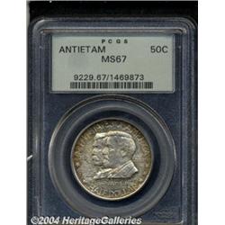 <B>1937<50C> Antietam MS67 PCGS.</B></I> Original with mottled crimson-russet toning drifting over satin textured features. A coin for the specialist who appreciates both color and high technical quality. <BR><BR><B>Important notice:</B> Heritage usually auctions material at the rate of 200-250 lots per hour. On some occasions eBay Live bid software or the Internet may not be able to keep up with the pace of the auction. We recommend placing a realistic absentee bid now as insurance to avoid disappointment. Occasionally the auctioneer may eliminate or reject an eBay Live bid, and the auctioneer may also reopen a lot after the close of the eBay live bidding (usually because we missed an audience bid), and may reject your bid even if it shows you as the winning bidder. By bidding via eBay Live, you agree that Heritage may award the lot to another bidder at its sole discretion under the circumstances described above or any other reasonable circumstances. Since eBay bids are not shown to us until we open the lot on the floor, we treat those bids just like floor bids. In most cases the floor responds before the eBay bid is presented to us, due to Internet lag time, so for consistency we have made it a policy that floor bids are always considered first over tie eBay live bids. Also please note that all Heritage lots purchased through eBay Live carry a 20% Buyer's Premium. Please make sure you read the Terms and Conditions before you bid.
